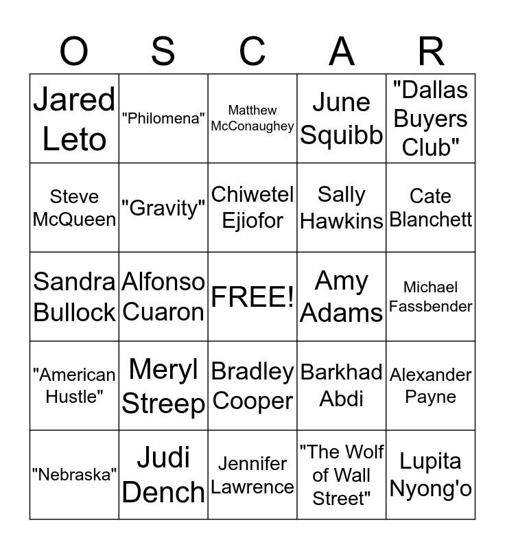 This bingo card has a free space and 34 words: 12 Years a Slave", "The Wolf of Wall Street", "Captain Phillips", "Her", "American Hustle", "Gravity", "Dallas Buyers Club", "Nebraska", "Philomena", Bruce Dern, Chiwetel Ejiofor, Matthew McConaughey, Leonardo DiCaprio, Christian Bale, Amy Adams, Cate Blanchett, Judi Dench, Sandra Bullock, Meryl Streep, Barkhad Abdi, Bradley Cooper, Jonah Hill, Jared Leto, Michael Fassbender, Jennifer Lawrence, Lupita Nyong'o, June Squibb, Julia Roberts, Sally Hawkins, Steve McQueen, David O. Russell, Alfonso Cuaron, Alexander Payne and Martin Scorsese.