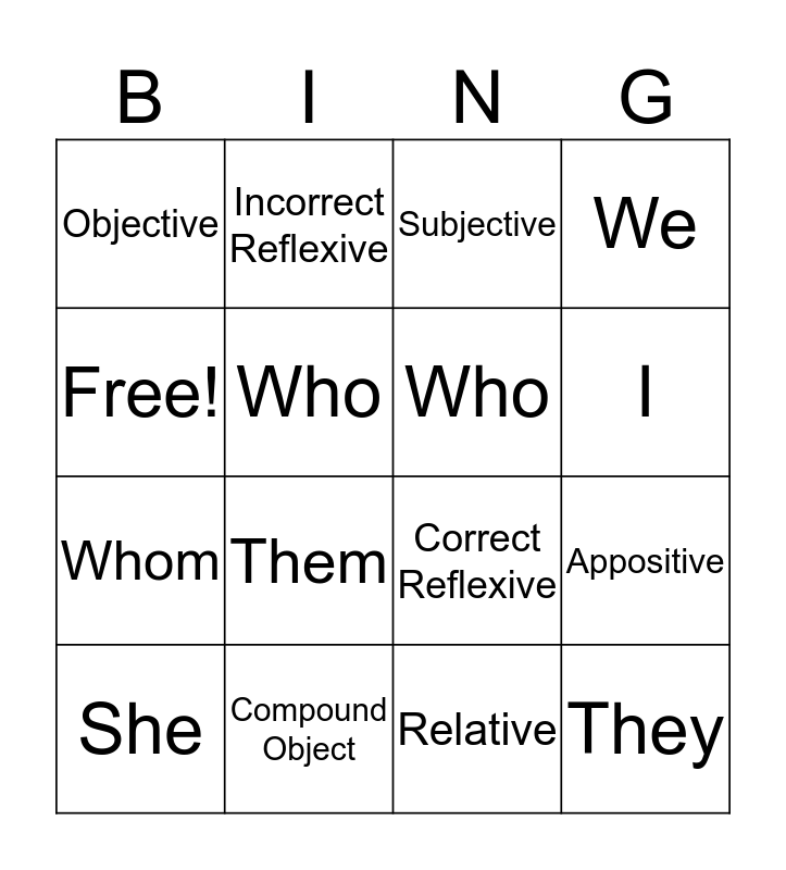 This bingo card has 16 words: Compound Object, Appositive, Subjective, Objective, Whom, Incorrect Reflexive, Correct Reflexive, Relative, Free!, Who, She, We, Them, I, Who and They.