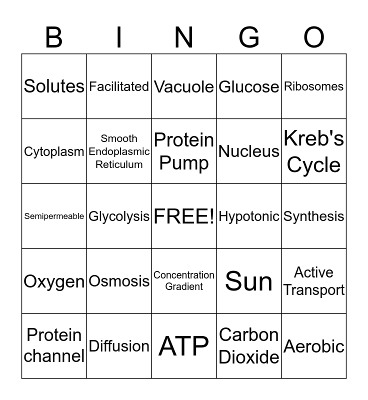 This bingo card has a free space and 24 words: Osmosis, Diffusion, Protein Pump, Protein channel, Ribosomes, Solutes, Cytoplasm, Facilitated, Hypotonic, Concentration Gradient, Nucleus, Semipermeable, Sun, Active Transport, Smooth Endoplasmic Reticulum, Carbon Dioxide, Synthesis, Vacuole, Kreb's Cycle, Glycolysis, Aerobic, Oxygen, Glucose and ATP.