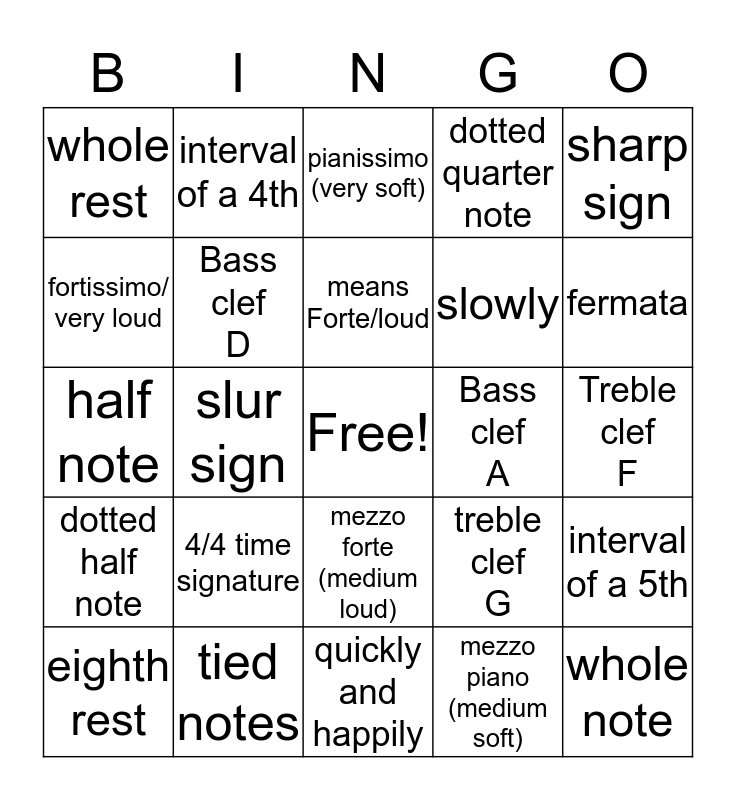 This bingo card has a free space and 24 words: 4/4 time signature, tied notes, means Forte/loud, eighth rest, sharp sign, whole rest, fortissimo/ very loud, interval of a 4th, Bass clef A, mezzo forte (medium loud), slowly, half note, treble clef G, interval of a 5th, Bass clef D, mezzo piano (medium soft), Treble clef F, pianissimo (very soft), fermata, slur sign, whole note, dotted half note, dotted quarter note and quickly and happily.