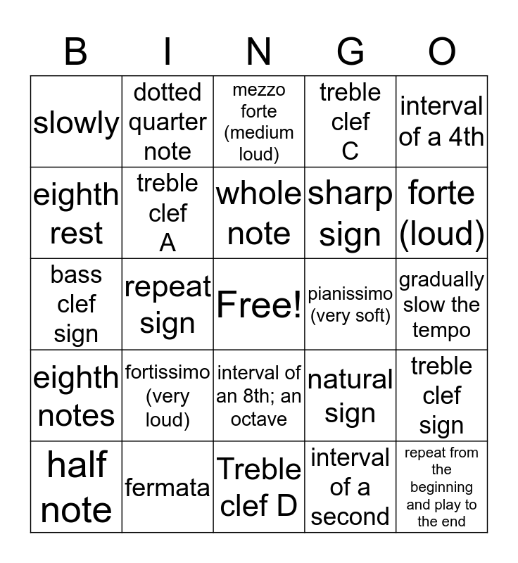 This bingo card has a free space and 24 words: fortissimo (very loud), fermata, whole note, half note, interval of a 4th, slowly, eighth rest, dotted quarter note, pianissimo (very soft), interval of an 8th; an octave, sharp sign, bass clef sign, natural sign, treble clef sign, treble clef A, interval of a second, gradually slow the tempo, mezzo forte (medium loud), forte (loud), repeat sign, repeat from the beginning and play to the end, eighth notes, treble clef C and Treble clef D.