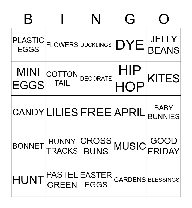 This bingo card has a free space and 24 words: BUNNY TRACKS, PASTEL GREEN, DECORATE, HUNT, JELLY BEANS, PLASTIC EGGS, MINI EGGS, FLOWERS, APRIL, CROSS BUNS, HIP HOP, CANDY, MUSIC, GOOD FRIDAY, COTTON TAIL, GARDENS, BABY BUNNIES, DUCKLINGS, KITES, LILIES, BLESSINGS, BONNET, DYE and EASTER EGGS.