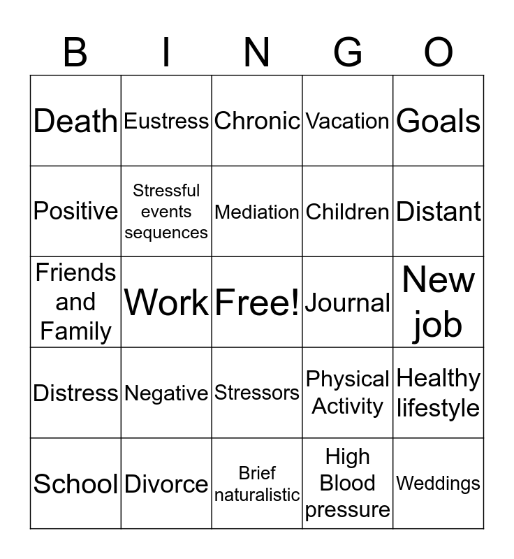This bingo card has a free space and 26 words: Stressors, High Blood pressure, Mediation, Divorce, Goals, Death, Positive, Eustress, New job, Physical Activity, Children, Friends and Family, Healthy lifestyle, School, Work, Self talk, Vacation, Distress, Chronic, Weddings, Distant, Brief naturalistic, Journal, Negative, Stressful events sequences and Acute time-limited.