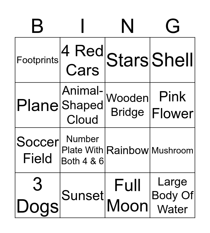 This bingo card has 17 words: Full Moon, 3 Dogs, Stars, Footprints, Number Plate With Both 4 & 6, Shell, Mushroom, Wooden Bridge, Pink Flower, Animal-Shaped Cloud, Sunset, Rainbow, Plane, 4 Red Cars, Soccer Field, Sunrise and Large Body Of Water.