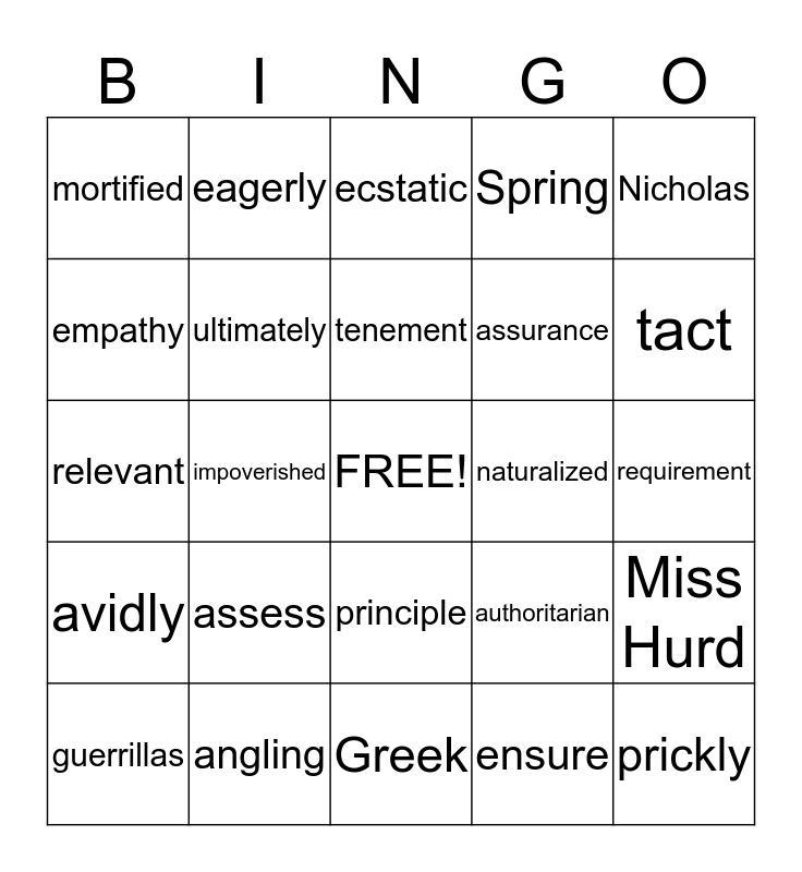 This bingo card has a free space and 24 words: assess, angling, tenement, guerrillas, Nicholas, mortified, empathy, eagerly, naturalized, principle, assurance, relevant, authoritarian, Miss Hurd, ultimately, ensure, requirement, ecstatic, tact, impoverished, prickly, avidly, Spring and Greek.