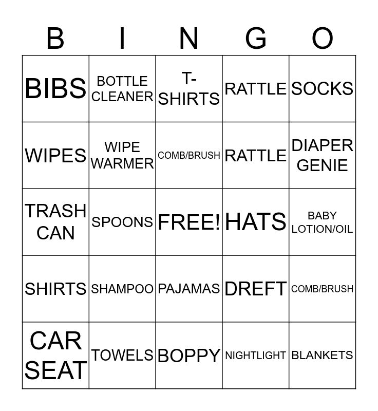 This bingo card has a free space and 24 words: SHAMPOO, TOWELS, COMB/BRUSH, CAR SEAT, SOCKS, BIBS, WIPES, BOTTLE CLEANER, HATS, PAJAMAS, RATTLE, TRASH CAN, DREFT, COMB/BRUSH, WIPE WARMER, NIGHTLIGHT, BABY LOTION/OIL, T-SHIRTS, DIAPER GENIE, SPOONS, BLANKETS, SHIRTS, RATTLE and BOPPY.