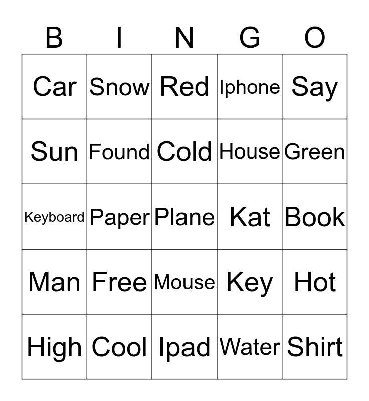 This bingo card has a free space and 24 words: Free, Cool, Cold, High, Say, Car, Sun, Snow, Kat, Mouse, House, Keyboard, Key, Hot, Found, Water, Book, Red, Green, Paper, Shirt, Man, Iphone and Ipad.