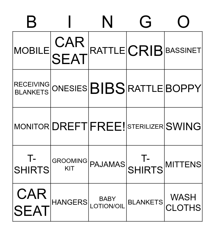This bingo card has a free space and 24 words: GROOMING KIT, HANGERS, BIBS, CAR SEAT, BASSINET, MOBILE, RECEIVING BLANKETS, CAR SEAT, STERILIZER, PAJAMAS, RATTLE, MONITOR, T-SHIRTS, MITTENS, ONESIES, BLANKETS, SWING, RATTLE, BOPPY, DREFT, WASH CLOTHS, T-SHIRTS, CRIB and BABY LOTION/OIL.