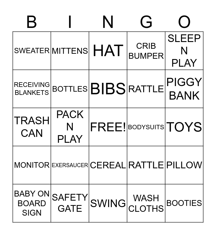 This bingo card has a free space and 24 words: EXERSAUCER, SAFETY GATE, BIBS, BABY ON BOARD SIGN, SLEEP N PLAY, SWEATER, RECEIVING BLANKETS, MITTENS, BODYSUITS, CEREAL, RATTLE, TRASH CAN, RATTLE, PILLOW, BOTTLES, WASH CLOTHS, TOYS, HAT, PIGGY BANK, PACK N PLAY, BOOTIES, MONITOR, CRIB BUMPER and SWING.