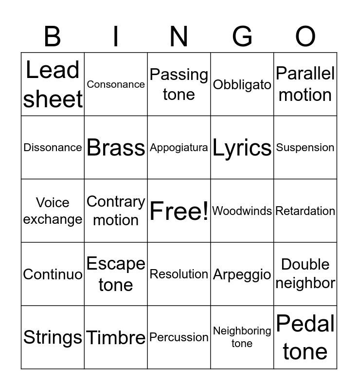 This bingo card has a free space and 42 words: Anticipation, Appogiatura, Embellishment/Ornament, Escape tone, Neighboring tone, Double neighbor, Pedal tone, Preparation, Passing tone, Resolution, Retardation, Suspension, Contrary motion, Parallel motion, Parallel intervals, Arpeggio, Chromatic, Voice exchange, Common Practice Period, Consonance, Dissonance, Figured bass, Flatted fifth, Lead sheet, Picardy third, Resolution, Lyrics, Melismatic, Stanza, Syllabic, Instrumentation, Continuo, Brass, Percussion, Rhythm section, Strings, Timbre, Woodwinds, Melody, Monophony, Obbligato and Ostinato.