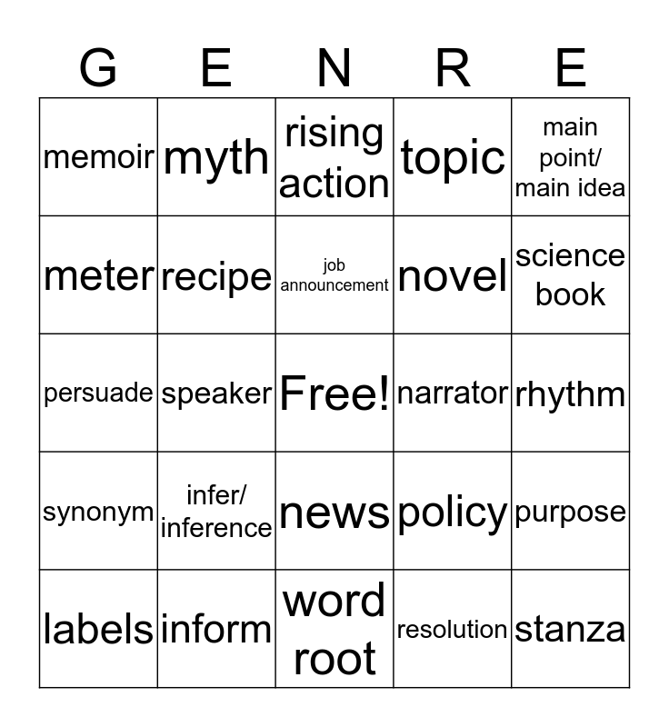 This bingo card has a free space and 24 words: infer/ inference, inform, job announcement, labels, main point/ main idea, memoir, meter, myth, narrator, news, novel, persuade, policy, purpose, recipe, resolution, rhythm, rising action, science book, speaker, stanza, synonym, topic and word root.