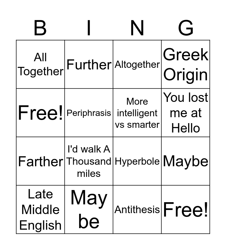 This bingo card has 16 words: May be, Maybe, Altogether, All Together, Farther, Further, Hyperbole, Antithesis, Free!, Periphrasis, Late Middle English, Greek Origin, I'd walk A Thousand miles, You lost me at Hello, More intelligent vs smarter and Free!.