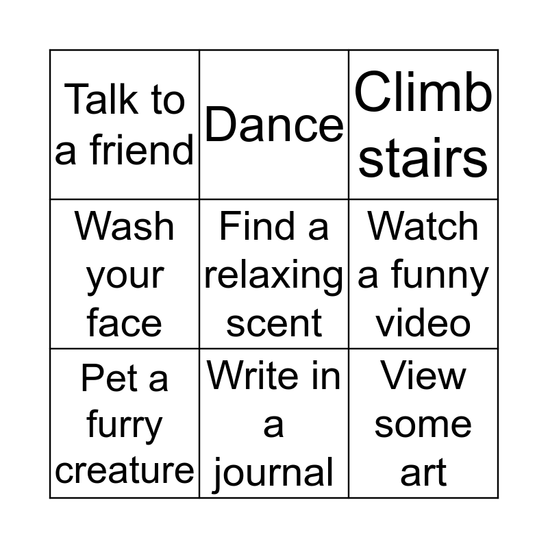 This bingo card has 9 words: Pet a furry creature, Climb stairs, Dance, Wash your face, Talk to a friend, Watch a funny video, Find a relaxing scent, View some art and Write in a journal.