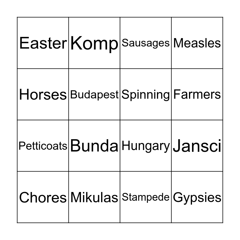This bingo card has 20 words: Jansci, Kate, Sausages, Milk, Chores, Horses, Mikulas, Easter, Petticoats, Komp, Bunda, Hungary, Budapest, Gypsies, Spinning, Shepherds, Farmers, Measles, Stampede and Tomboy.