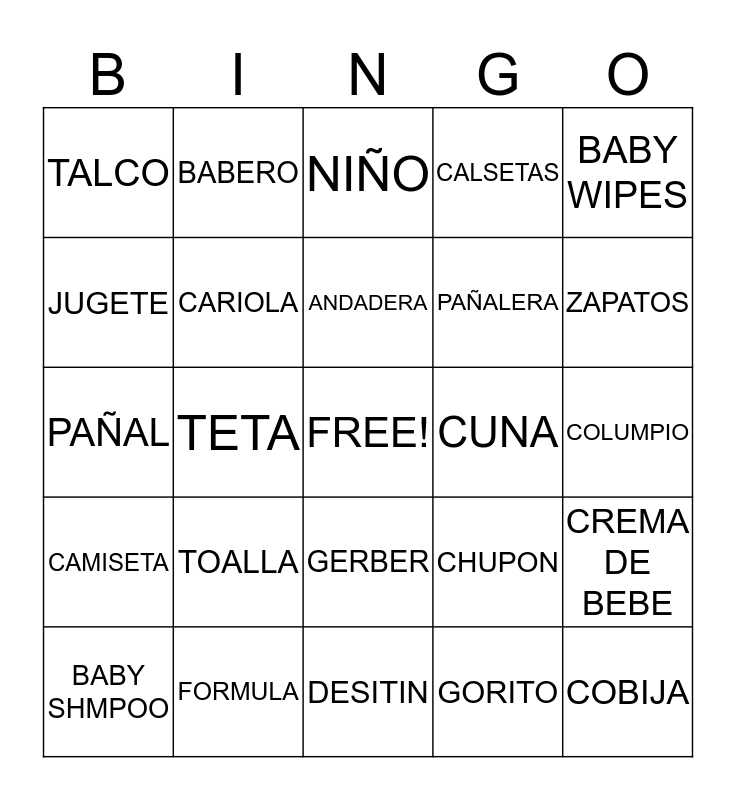 This bingo card has a free space and 24 words: TOALLA, FORMULA, ANDADERA, BABY SHMPOO, BABY WIPES, TALCO, JUGETE, BABERO, CUNA, GERBER, PAÑALERA, PAÑAL, CHUPON, CREMA DE BEBE, CARIOLA, GORITO, COLUMPIO, NIÑO, ZAPATOS, TETA, COBIJA, CAMISETA, CALSETAS and DESITIN.