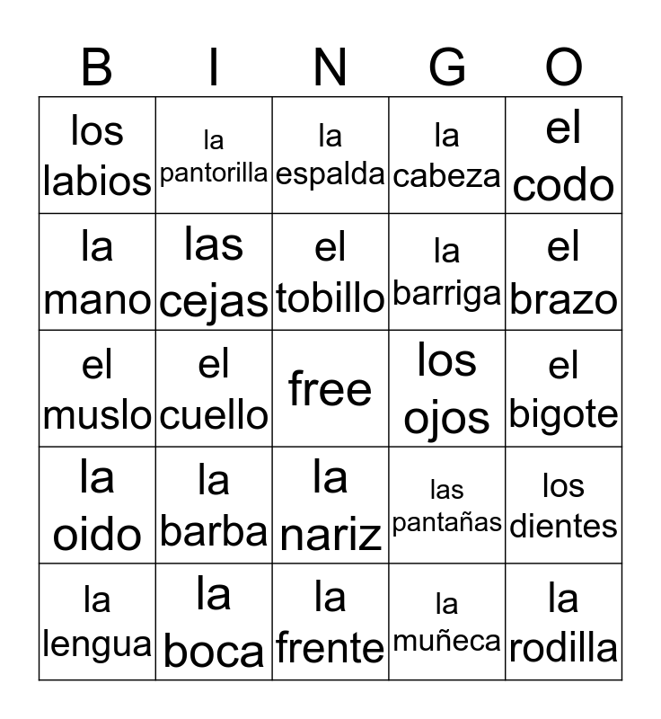 This bingo card has a free space and 24 words: la barba, la boca, el tobillo, la lengua, el codo, los labios, la mano, la pantorilla, los ojos, la nariz, la barriga, el muslo, las pantañas, los dientes, las cejas, la muñeca, el bigote, la espalda, el brazo, el cuello, la rodilla, la oido, la cabeza and la frente.