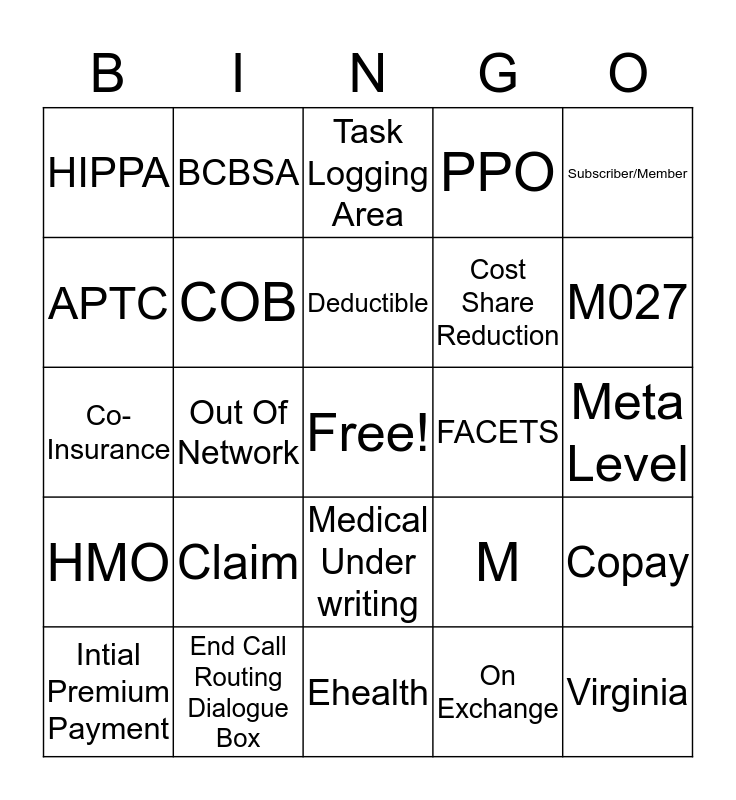 This bingo card has a free space and 39 words: ACA, IN NETWORK, Premium, COB, Intial Premium Payment, Medical Under writing, Deductible, DC, Subscriber/Member, HMO, Out Of Network, PPO, Virginia, Meta Level, FACETS, Claim, M041, HIPPA, Authorization, M, APTC, Ehealth, Cost Share Reduction, M027, D, R, W, Tiered Deductible, Non Tiered Deductible, BCBSA, SANC, Non Member/ New Group, Task Logging Area, End Call Routing Dialogue Box, On Exchange, Off Exchange, Copay, Co- Insurance and Navigation Pane.