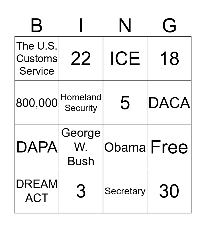 This bingo card has 16 words: 3, Free, ICE, The U.S. Customs Service, DAPA, 22, Obama, Secretary, 800,000, Homeland Security, DREAM ACT, 18, George W. Bush, DACA, 5 and 30.