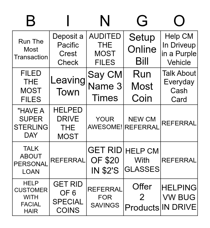 This bingo card has a free space and 24 words: REFERRAL, GET RID OF 6 SPECIAL COINS, Say CM Name 3 Times, HELP CUSTOMER WITH FACIAL HAIR, Help CM In Driveup in a Purple Vehicle, Run The Most Transaction, FILED THE MOST FILES, Deposit a Pacific Crest Check, NEW CM REFERRAL, GET RID OF $20 IN $2'S, Run Most Coin, "HAVE A SUPER STERLING DAY, HELP CM With GLASSES, REFERRAL, Leaving Town, Offer 2 Products, REFERRAL, AUDITED THE MOST FILES, Talk About Everyday Cash Card, HELPED DRIVE THE MOST, HELPING VW BUG IN DRIVE, TALK ABOUT PERSONAL LOAN, Setup Online Bill and REFERRAL FOR SAVINGS.