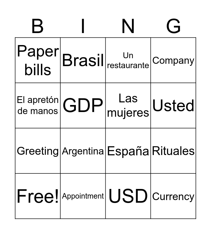 This bingo card has 19 words: Free!, Entre dos y cinco, Brasil, España, Currency, Paper bills, Appointment, Un restaurante, Company, Greeting, GDP, Las mujeres, Rituales, El toreo, Argentina, USD, Usted, El apretón de manos and Hierarchy.