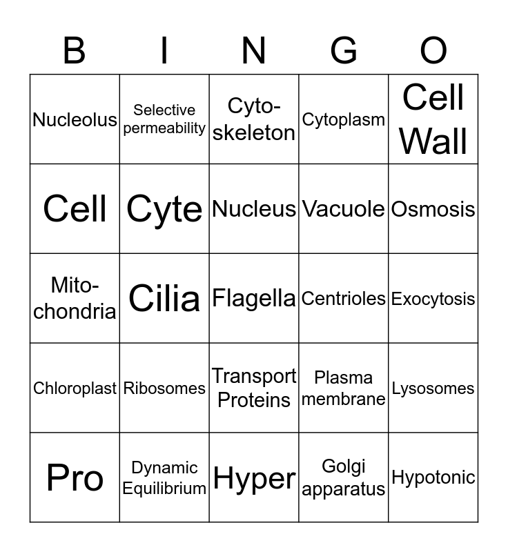 This bingo card has a free space and 24 words: Ribosomes, Dynamic Equilibrium, Nucleus, Pro, Cell Wall, Nucleolus, Cell, Selective permeability, Centrioles, Transport Proteins, Vacuole, Mito- chondria, Plasma membrane, Lysosomes, Cyte, Golgi apparatus, Exocytosis, Cyto- skeleton, Osmosis, Cilia, Hypotonic, Chloroplast, Cytoplasm and Hyper.