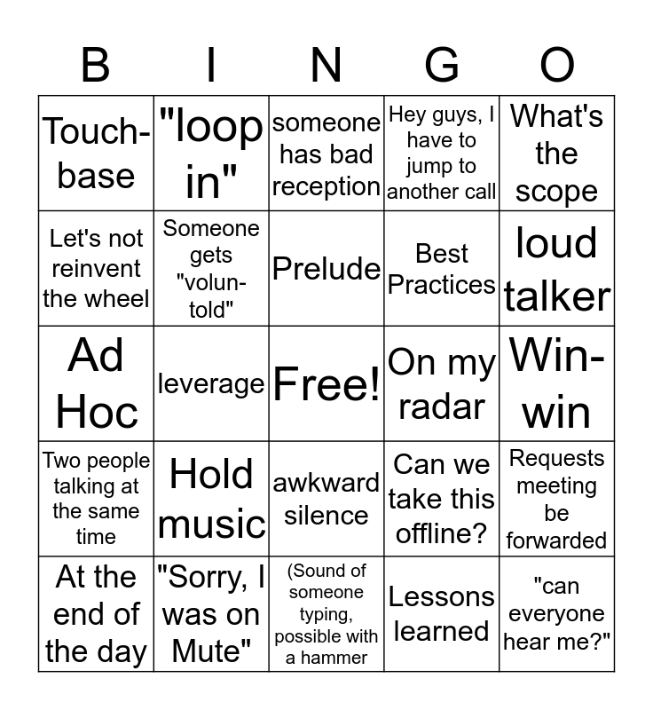 This bingo card has a free space and 24 words: Hold music, "Sorry, I was on Mute", Prelude, At the end of the day, What's the scope, Touch-base, Let's not reinvent the wheel, "loop in", On my radar, awkward silence, Best Practices, Ad Hoc, Can we take this offline?, Requests meeting be forwarded, Someone gets "volun-told", Lessons learned, Win-win, someone has bad reception, loud talker, leverage, "can everyone hear me?", Two people talking at the same time, Hey guys, I have to jump to another call and (Sound of someone typing, possible with a hammer.