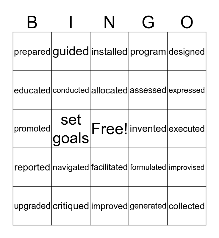 This bingo card has a free space and 24 words: navigated, critiqued, allocated, upgraded, designed, prepared, educated, guided, invented, facilitated, assessed, promoted, formulated, improvised, conducted, generated, executed, installed, expressed, set goals, collected, reported, program and improved.