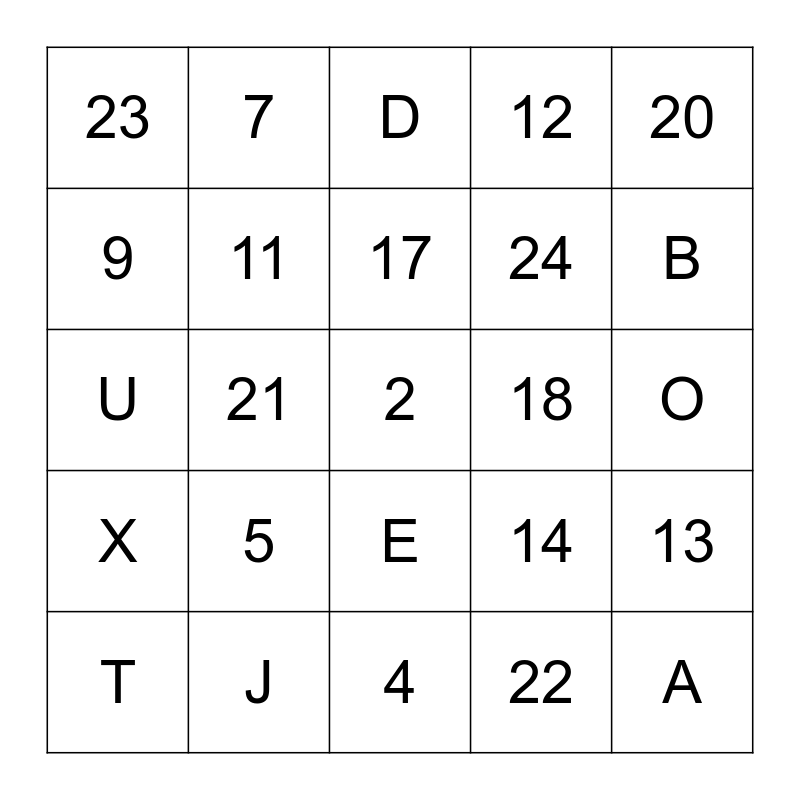 This bingo card has 50 words: 1, 2, 3, 4, 5, 6, 7, 8, 9, 10, 11, 12, 13, 14, 15, 16, 17, 18, 19, 20, 21, 22, 23, 24, 25, A, B, C, D, E, F, G, H, I, J, K, L, M, N, O, P, Q, R, S, T, U, V, W, X and Y.