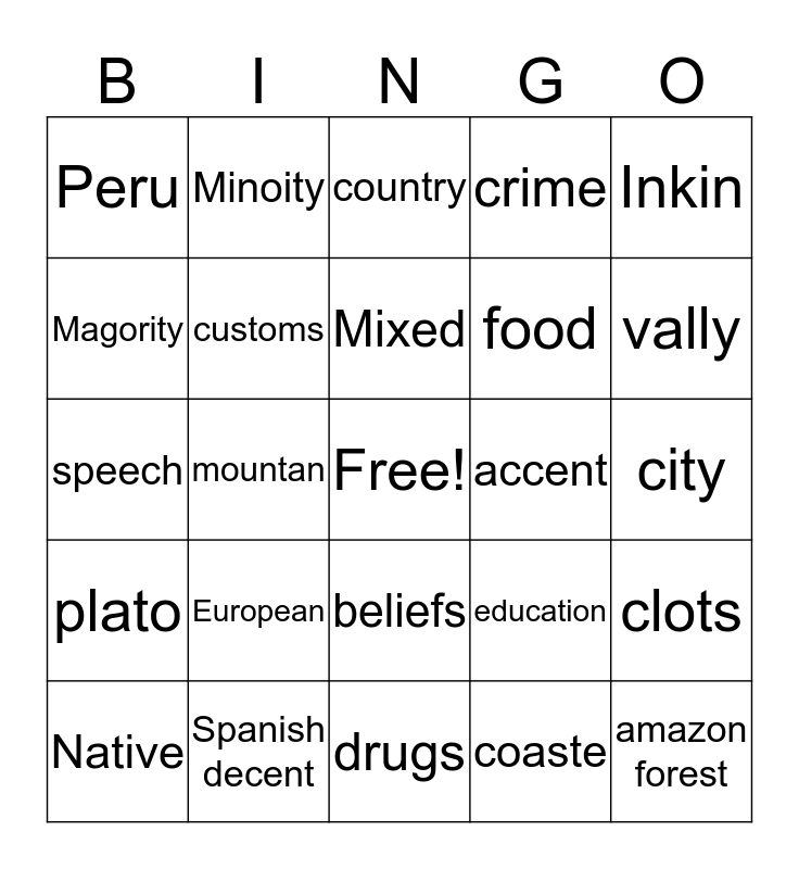 This bingo card has a free space and 24 words: European, Spanish decent, Mixed, Native, Inkin, Peru, Magority, Minoity, accent, beliefs, food, speech, education, clots, customs, coaste, city, country, vally, mountan, amazon forest, plato, crime and drugs.