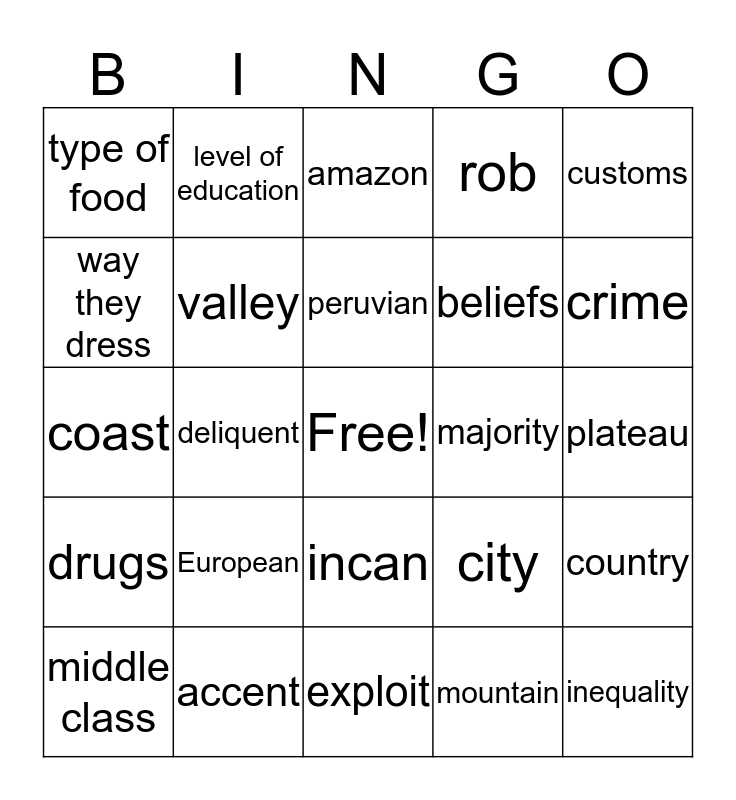 This bingo card has a free space and 24 words: European, accent, peruvian, middle class, customs, type of food, way they dress, level of education, majority, incan, beliefs, coast, city, country, valley, mountain, plateau, amazon, crime, deliquent, inequality, drugs, rob and exploit.