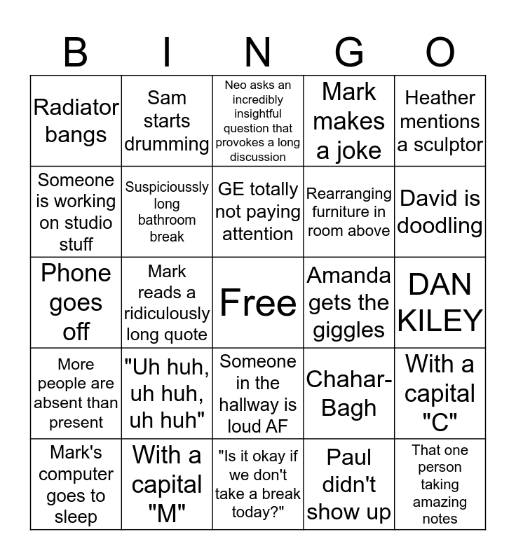 This bingo card has a free space and 24 words: "Uh huh, uh huh, uh huh", With a capital "M", GE totally not paying attention, Mark's computer goes to sleep, Heather mentions a sculptor, Radiator bangs, Someone is working on studio stuff, Sam starts drumming, Amanda gets the giggles, Someone in the hallway is loud AF, Rearranging furniture in room above, Phone goes off, Chahar-Bagh, With a capital "C", Suspicioussly long bathroom break, Paul didn't show up, DAN KILEY, Neo asks an incredibly insightful question that provokes a long discussion, David is doodling, Mark reads a ridiculously long quote, That one person taking amazing notes, More people are absent than present, Mark makes a joke and "Is it okay if we don't take a break today?".