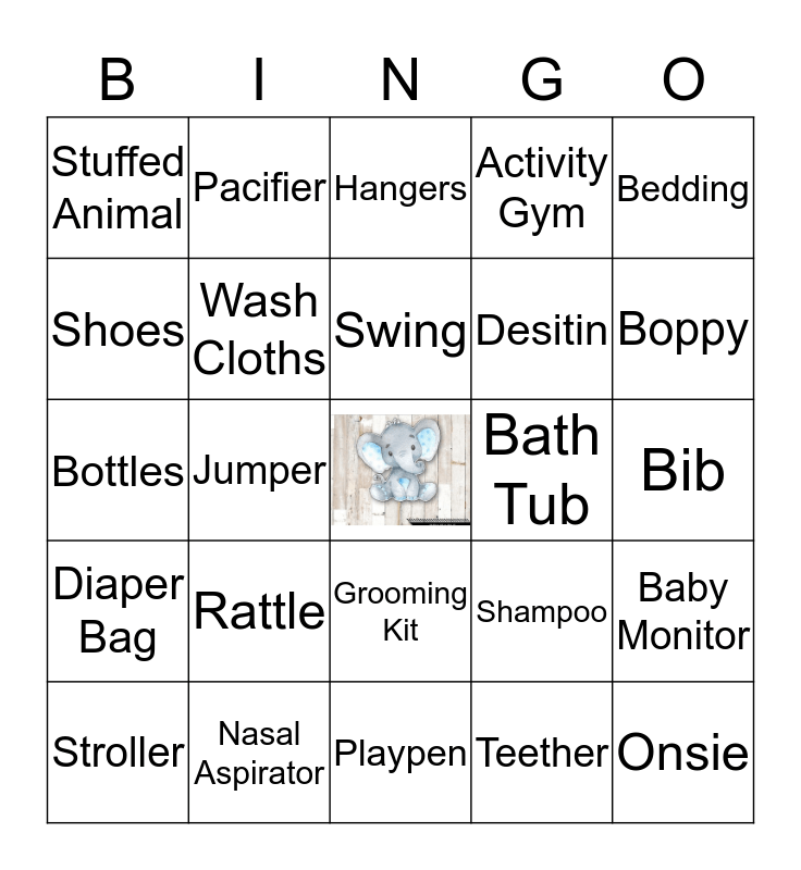 This bingo card has a free space and 24 words: Rattle, Nasal Aspirator, Swing, Stroller, Bedding, Stuffed Animal, Shoes, Pacifier, Bath Tub, Grooming Kit, Desitin, Bottles, Shampoo, Baby Monitor, Wash Cloths, Teether, Bib, Hangers, Boppy, Jumper, Onsie, Diaper Bag, Activity Gym and Playpen.