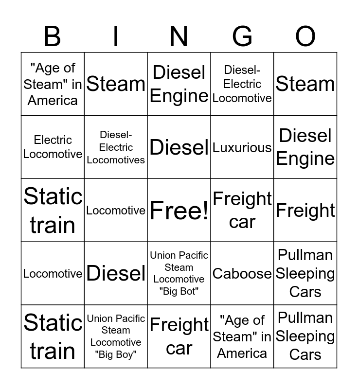 This bingo card has a free space and 24 words: Diesel, Union Pacific Steam Locomotive "Big Boy", Diesel, Static train, Steam, "Age of Steam" in America, Electric Locomotive, Steam, Freight car, Union Pacific Steam Locomotive "Big Bot", Luxurious, Static train, Caboose, Pullman Sleeping Cars, Diesel-Electric Locomotives, "Age of Steam" in America, Freight, Diesel Engine, Diesel Engine, Locomotive, Pullman Sleeping Cars, Locomotive, Diesel-Electric Locomotive and Freight car.