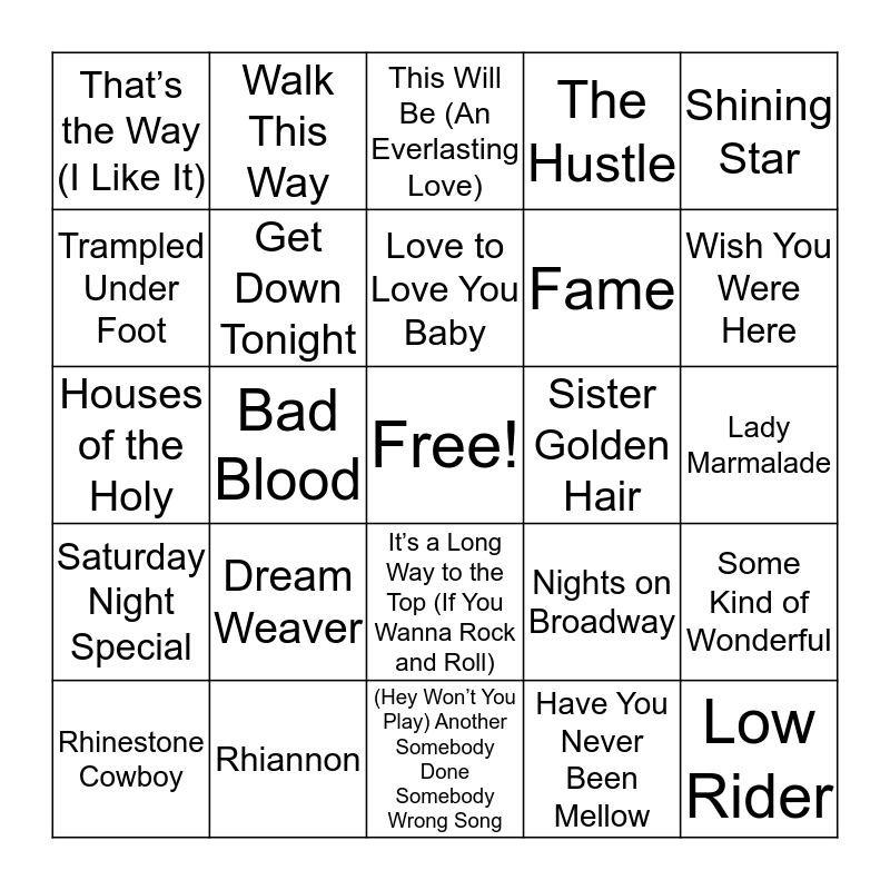 This bingo card has a free space and 55 words: Jive Talkin’, Rhinestone Cowboy, Love Will Keep Us Together, That’s the Way (I Like It), (Hey Won’t You Play) Another Somebody Done Somebody Wrong Song, My Eyes Adored You, Get Down Tonight, I’m Not in Love, Fame, Bohemian Rhapsody, The Hustle, One of These Nights, Philadelphia Freedom, Fallin’ in Love, How Sweet It Is (To Be Loved by You), Never Can Say Goodbye, Shining Star, Bad Blood, Lyin’ Eyes, Low Rider, Sister Golden Hair, Why Can’t We Be Friends?, Nights on Broadway, This Will Be (An Everlasting Love), Someone Saved My Life Tonight, Love to Love You Baby, Have You Never Been Mellow, Lovin’ You, Lady Marmalade, Some Kind of Wonderful, You Ain’t Seen Nothing Yet, Boogie Shoes, Fly by Night, Tangled Up in Blue, Trampled Under Foot, Houses of the Holy, Rock and Roll All Nite, Saturday Night Special, Dance with Me, Sweet Emotion, Walk This Way, Tush, S.O.S., Listen to What the Man Said, Dream Weaver, Rhiannon, Say You Love Me, Sara Smile, Born to Run, Wish You Were Here, Evil Woman, Stranglehold, Still Crazy After All These Years, It’s a Long Way to the Top (If You Wanna Rock and Roll) and Feel Like Makin’ Love.