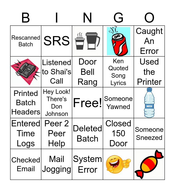 This bingo card has 6 images, a free space and 18 words: Peer 2 Peer Help, Mail Jogging, Door Bell Rang, Checked Email, Caught An Error, Rescanned Batch, SRS, Someone Yawned, Deleted Batch, Ken Quoted Song Lyrics, Printed Batch Headers, Closed 150 Door, Someone Sneezed, Listened to Shai's Call, Used the Printer, Hey Look! There's Don Johnson, Entered Time Logs and System Error.
