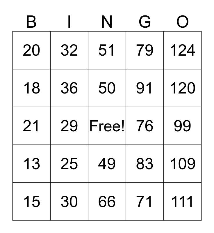 This bingo card has a free space and 125 words: 1, 24, 47, 70, 93, 2, 25, 48, 71, 94, 3, 26, 72, 95, 4, 27, 49, 73, 96, 5, 28, 50, 74, 97, 6, 29, 51, 75, 98, 7, 30, 52, 76, 99, 8, 31, 53, 77, 100, 9, 32, 54, 78, 101, 10, 33, 55, 79, 102, 11, 34, 56, 80, 103, 12, 35, 57, 81, 104, 13, 36, 58, 82, 105, 14, 37, 59, 83, 106, 15, 38, 60, 84, 107, 16, 39, 61, 85, 108, 17, 40, 62, 86, 109, 18, 41, 63, 87, 110, 19, 42, 64, 88, 111, 20, 43, 65, 89, 112, 21, 44, 66, 90, 113, 22, 45, 67, 91, 114, 23, 46, 68, 92, 115, 69, 116, 117, 118, 119, 120, 121, 122, 123, 124 and 125.