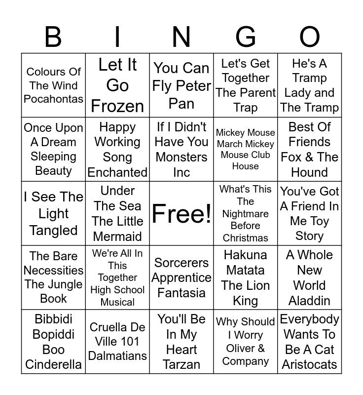 This bingo card has a free space and 45 words: Heigh Ho Snow White and the Seven Dwarfs, Under The Sea The Little Mermaid, Breaking Free High School Musical, I Wanna Be Like You The Jungle Book, Everybody Wants To Be A Cat Aristocats, Zip A Dee Doo Dah Song of the South, Let It Go Frozen, Thats The Life For Me James and the Giant Peach, Mickey Mouse March Mickey Mouse Club House, A Whole New World Aladdin, Once Upon A Dream Sleeping Beauty, We're All In This Together High School Musical, If I Didn't Have You Monsters Inc, Hakuna Matata The Lion King, Little April Showers Bambi, The Wonderful Thing About Tiggers Winnie The Poo, A Star Is Born Hercules, You Can Fly Peter Pan, A Pirate's Life For Me Pirates Of The Caribbean, Best Of Friends Fox & The Hound, Colours Of The Wind Pocahontas, Give A Little Whistle Pinocchio, You'll Be In My Heart Tarzan, Let's Get Together The Parent Trap, I'll Make A Man Out Of You Mulan, Bibbidi Bopiddi Boo Cinderella, Prince Ali Aladdin, Tale As Old As Time Beauty & The Beast, Why Should I Worry Oliver & Company, You've Got A Friend In Me Toy Story, Do You Want To Build A Snowman Frozen, Cruella De Ville 101 Dalmatians, Sorcerers Apprentice Fantasia, When I See An Elephant Fly Dumbo, Can You Feel The Love Tonight Lion King, The Bare Necessities The Jungle Book, Someday Hunchback Of Notre Dame, Chim Chim Cheroo Mary Poppins, Almost There Princess And The Frog, He's A Tramp Lady and The Tramp, I See The Light Tangled, Happy Working Song Enchanted, When She Loved Me Toy Story 2, What's This The Nightmare Before Christmas and Part Of Your World The Little Mermaid.