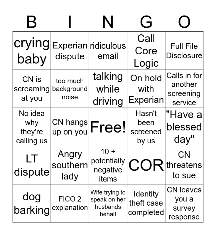 This bingo card has a free space and 33 words: I don't owe any money, CN is in a drive-thru, CN hangs up on you, extremely friendly CN, LT dispute, too much background noise, Full File Disclosure, dog barking, Experian dispute, Someone pretending to be the CN, talking while driving, ridiculous email, Criminal dispute, "I didn't authorize nothing", Hasn't been screened by us, Calls in for another screening service, FICO 2 explanation, No idea why they're calling us, Angry southern lady, COR, 10 + potentially negative items, Puts you on hold, crying baby, "Have a blessed day", Wife trying to speak on her husbands behalf, CN leaves you a survey response, Call Core Logic, On hold with Experian, CN is screaming at you, CN threatens to sue, Case open for 25 days or more, Identity theft case completed and screening report fails.