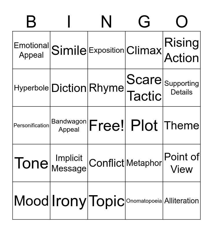 This bingo card has a free space and 24 words: Implicit Message, Irony, Rhyme, Mood, Rising Action, Emotional Appeal, Hyperbole, Simile, Plot, Conflict, Scare Tactic, Personification, Metaphor, Point of View, Diction, Onomatopoeia, Theme, Exposition, Supporting Details, Bandwagon Appeal, Alliteration, Tone, Climax and Topic.