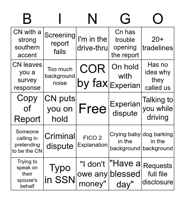 This bingo card has a free space and 31 words: "I don't owe any money", Hasn't been screened by us, CN puts you on hold, Extremely friendly CN, CN with a strong southern accent, I'm in the drive-thru, Too much background noise, Crying baby in the background, Experian dispute, "Have a blessed day", Talking to you while driving, Requests full file disclosure, LT dispute, "I didn't authorize anything", Has no idea why they called us, COR by mail, dog barking in the background, Criminal dispute, Someone calling in pretending to be the CN, FICO 2 Explanation, 20+ tradelines, CN hangs up on you, Trying to speak on their spouse's behalf, Screening report fails, On hold with Experian, CN leaves you a survey response, Cn has trouble opening the report, Copy of Report, Typo in SSN, COR by fax and Call into RentBureau.