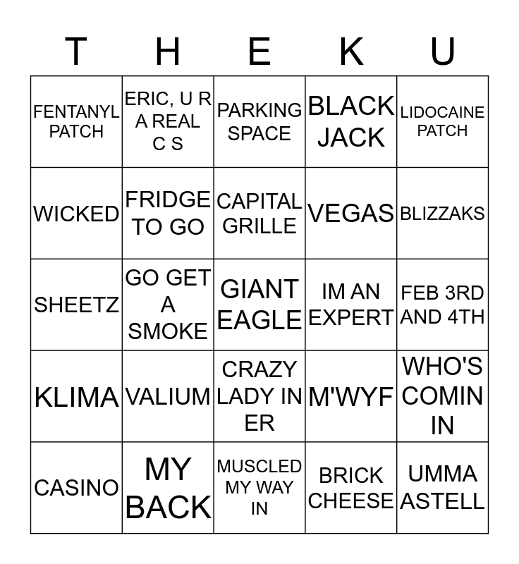 This bingo card has a free space and 24 words: VALIUM, MY BACK, CAPITAL GRILLE, CASINO, LIDOCAINE PATCH, FENTANYL PATCH, WICKED, ERIC, U R A REAL C S, IM AN EXPERT, CRAZY LADY IN ER, VEGAS, SHEETZ, M'WYF, WHO'S COMIN IN, FRIDGE TO GO, BRICK CHEESE, FEB 3RD AND 4TH, PARKING SPACE, BLIZZAKS, GO GET A SMOKE, UMMA ASTELL, KLIMA, BLACK JACK and MUSCLED MY WAY IN.