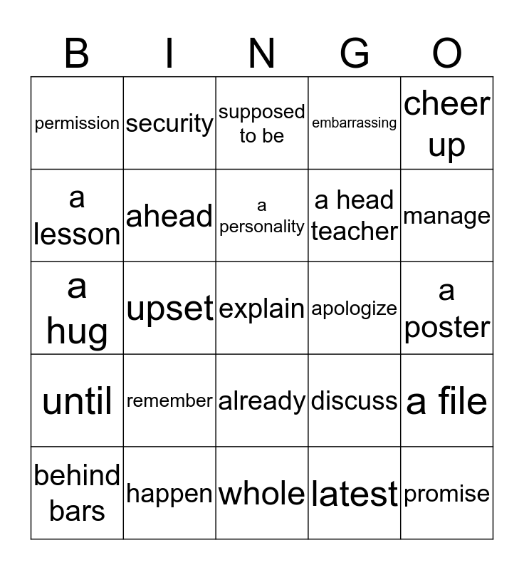 This bingo card has 35 words: a conversation, join, trouble, ahead, already, embarrassing, a lesson, a liar, a personality, have a crush on, a hug, cheer up, should, be ashamed of, permission, apologize, latest, upset, until, explain, discuss, behind bars, a file, happen, supposed to be, manage, promise, be enough, a head teacher, a poster, a bulletin board, whole, remember, security and guess.