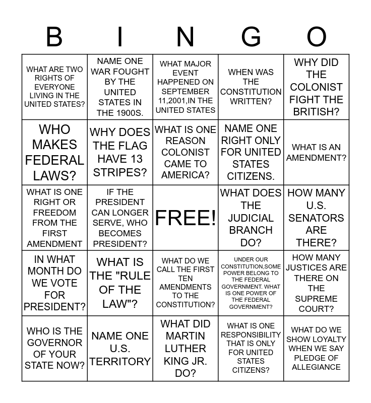 This bingo card has a free space and 24 words: WHAT IS THE "RULE OF THE LAW"?, NAME ONE U.S. TERRITORY, WHAT IS ONE REASON COLONIST CAME TO AMERICA?, WHO IS THE GOVERNOR OF YOUR STATE NOW?, WHY DID THE COLONIST FIGHT THE BRITISH?, WHAT ARE TWO RIGHTS OF EVERYONE LIVING IN THE UNITED STATES?, WHO MAKES FEDERAL LAWS?, NAME ONE WAR FOUGHT BY THE UNITED STATES IN THE 1900S., WHAT DOES THE JUDICIAL BRANCH DO?, WHAT DO WE CALL THE FIRST TEN AMENDMENTS TO THE CONSTITUTION?, NAME ONE RIGHT ONLY FOR UNITED STATES CITIZENS., WHAT IS ONE RIGHT OR FREEDOM FROM THE FIRST AMENDMENT, UNDER OUR CONSTITUTION,SOME POWER BELONG TO THE FEDERAL GOVERNMENT. WHAT IS ONE POWER OF THE FEDERAL GOVERNMENT?, HOW MANY JUSTICES ARE THERE ON THE SUPREME COURT?, WHY DOES THE FLAG HAVE 13 STRIPES?, WHAT IS ONE RESPONSIBILITY THAT IS ONLY FOR UNITED STATES CITIZENS?, HOW MANY U.S. SENATORS ARE THERE?, WHAT MAJOR EVENT HAPPENED ON SEPTEMBER 11,2001,IN THE UNITED STATES, WHAT IS AN AMENDMENT?, IF THE PRESIDENT CAN LONGER SERVE, WHO BECOMES PRESIDENT?, WHAT DO WE SHOW LOYALTY WHEN WE SAY PLEDGE OF ALLEGIANCE, IN WHAT MONTH DO WE VOTE FOR PRESIDENT?, WHEN WAS THE CONSTITUTION WRITTEN? and WHAT DID MARTIN LUTHER KING JR. DO?.
