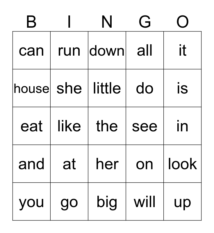 This bingo card has a free space and 24 words: at, go, little, you, it, can, house, run, see, her, do, eat, on, look, she, will, in, down, is, like, up, and, all and big.