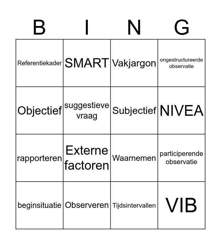 This bingo card has 16 words: Observeren, participerende observatie, Vakjargon, Referentiekader, rapporteren, SMART, Waarnemen, Tijdsintervallen, Objectief, suggestieve vraag, beginsituatie, ongestructureerde observatie, Externe factoren, NIVEA, Subjectief and VIB.