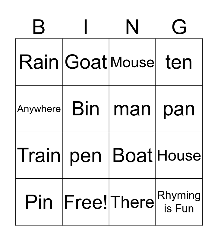 This bingo card has 16 words: Free!, House, Mouse, Rain, Train, Goat, Boat, There, Anywhere, Bin, Pin, ten, pen, pan, man and Rhyming is Fun.
