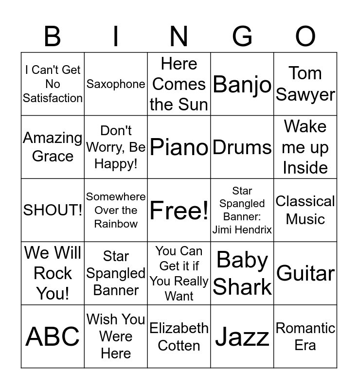 This bingo card has a free space and 29 words: ABC, Stand By Me, Somewhere Over the Rainbow, Three Little Birds, I Can't Get No Satisfaction, Here Comes the Sun, Don't Worry, Be Happy!, Star Spangled Banner, Star Spangled Banner: Jimi Hendrix, Wish You Were Here, Classical Music, Romantic Era, Elizabeth Cotten, Jazz, Wake me up Inside, Gangnam Style, You Can Get it if You Really Want, We Will Rock You!, Tom Sawyer, SHOUT!, Baby Shark, Harder, Better, Faster, Stronger, Drums, Amazing Grace, Banjo, Saxophone, Guitar, Piano and Respect.