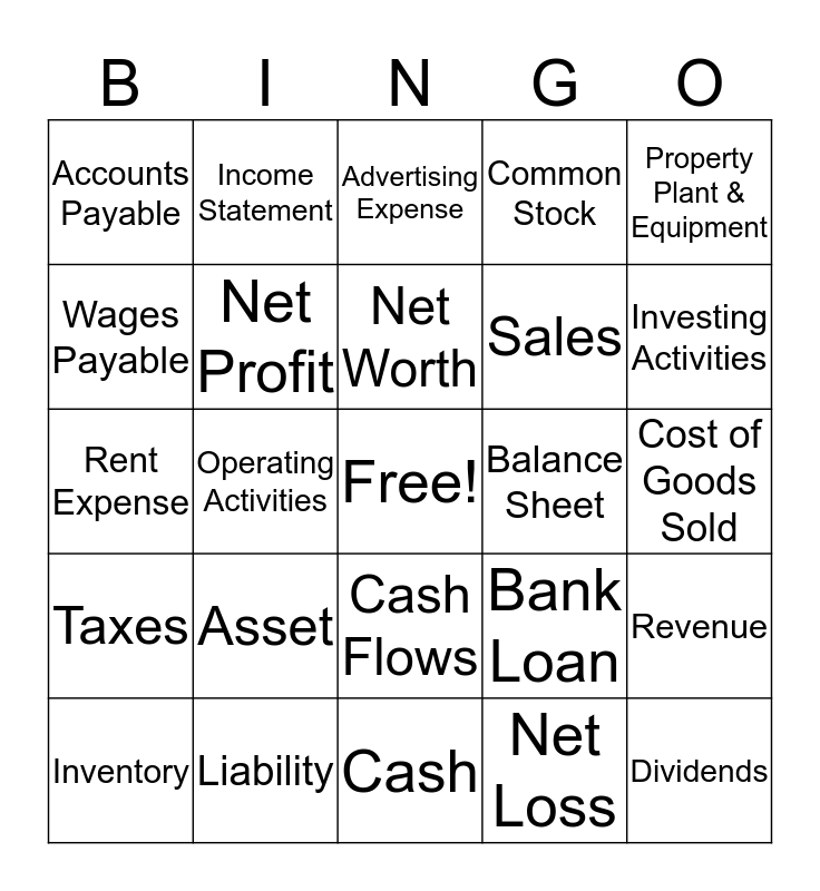 This bingo card has a free space and 24 words: Asset, Liability, Net Worth, Inventory, Property Plant & Equipment, Accounts Payable, Wages Payable, Income Statement, Balance Sheet, Cash Flows, Sales, Rent Expense, Bank Loan, Revenue, Net Profit, Net Loss, Cost of Goods Sold, Advertising Expense, Investing Activities, Operating Activities, Dividends, Taxes, Common Stock and Cash.