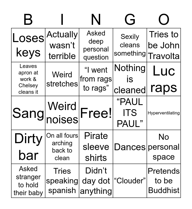 This bingo card has a free space and 29 words: Asked stranger to hold their baby, Hit on poor unsuspecting girl, Weird noises, Invasive love life questions, Loses keys, Asked deep personal question, Weird stretches, On all fours arching back to clean, “PAUL ITS PAUL”, Tries speaking spanish, Hyperventilating, Pretends to be Buddhist, Didn’t day dot anything, “Clouder”, Luc raps, Talks about religion, Pirate sleeve shirts, Dirty bar, Tries to be John Travolta, Sang, Dances, That one stupid sweater, Nothing is cleaned, Leaves apron at work & Chelsey cleans it, Sexily cleans something, Actually wasn’t terrible, No personal space, “I went from rags to rags” and “Do it how you live it”.