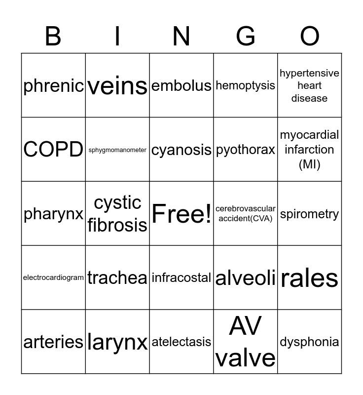 This bingo card has a free space and 34 words: mitral valve, AV valve, pericardium, normal sinus rhythm, electrocardiogram, sphygmomanometer, hypertensive heart disease, arteries, veins, pulmonary artery, cyanosis, embolus, thrombus, aneurysm, cerebrovascular accident(CVA), myocardial infarction (MI), larynx, pharynx, trachea, alveoli, infracostal, mycolytic, phrenic, spirometry, atelectasis, dysphonia, hemoptysis, asphyxia, pyothorax, COPD, epistaxis, cystic fibrosis, rales and perfusion.